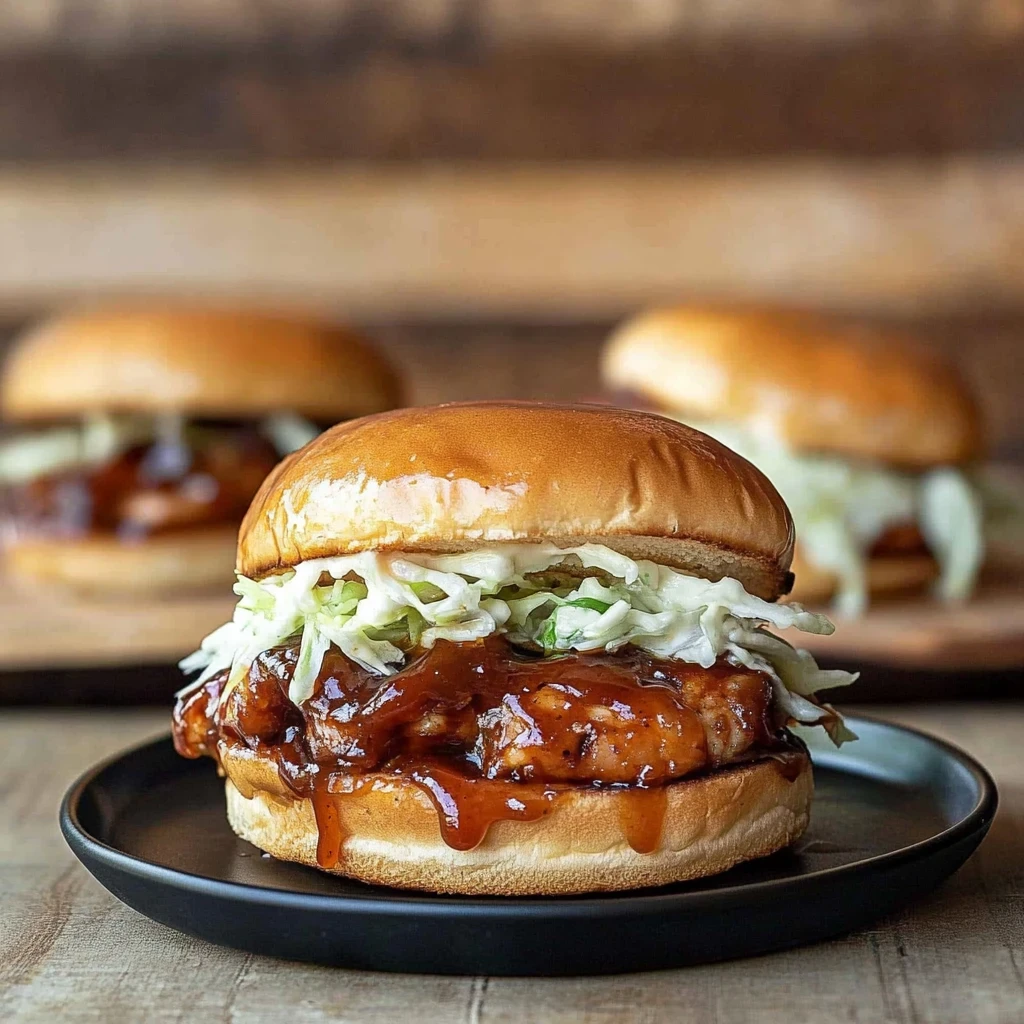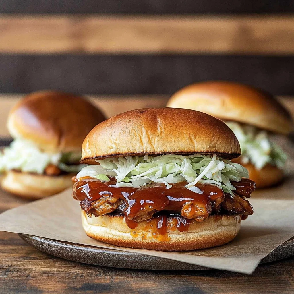 Assemble the Sandwiches: Now that your chicken is perfectly cooked and coated in BBQ goodness, let’s bring everything together! Start by toasting 4 burger buns on your grill or in a toaster until they reach a lovely golden brown color; this adds a delightful crunch. On the bottom half of each bun, generously heap on some of that shredded BBQ chicken—don’t be shy here; you want these sandwiches to be hearty! Next, pile on about ½ cup of coleslaw on top for that creamy crunch—store-bought or homemade works beautifully here. If you love a bit of tanginess, throw on a few pickles for extra flavor before capping off your creation with the top half of the bun. Now comes the best part: serve these BBQ chicken sandwiches immediately while they’re hot and enjoy every bite! Each mouthful will be bursting with smoky sweetness and crunch, making this meal perfect for any occasion.
