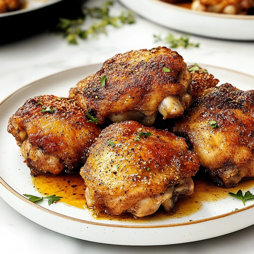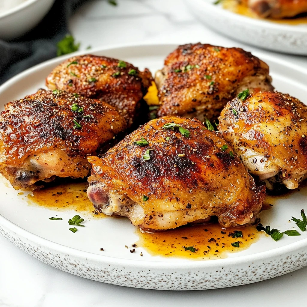 Cooking: Once your chicken is seasoned to perfection, it’s time for it to shine in the oven. Line a baking sheet with parchment paper or foil for easy cleanup and lay the seasoned chicken thighs skin-side up on top. The sight of those golden-brown thighs is just mouthwatering! Slide them into your preheated oven and let them roast for about 35-45 minutes. You’ll know they’re ready when they reach an internal temperature of 165°F (74°C) and that glorious skin turns crispy and golden brown. I find that halfway through cooking, it’s nice to peek through the oven door just to admire how well they’re browning (and maybe snap a pic!). Once cooked, carefully remove the baking sheet from the oven—watch out for any hot splatters! Let your chicken rest for about 5 minutes before serving; this allows the juices to redistribute, ensuring each bite is tender and succulent. Enjoy this simple yet flavorful dish that brings warmth to your table!