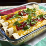 Bake Until Golden Brown: Place filled tortillas seam-side down in the dish. Pour remaining sauce over them and top with more cheese. Bake for 25-30 minutes until bubbly and golden brown.