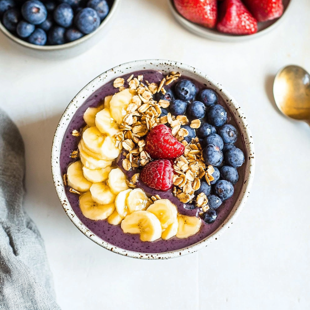 Top It Off!: Now comes the fun part! Arrange sliced bananas, strawberries, blueberries, and any other toppings you desire over the acai base.