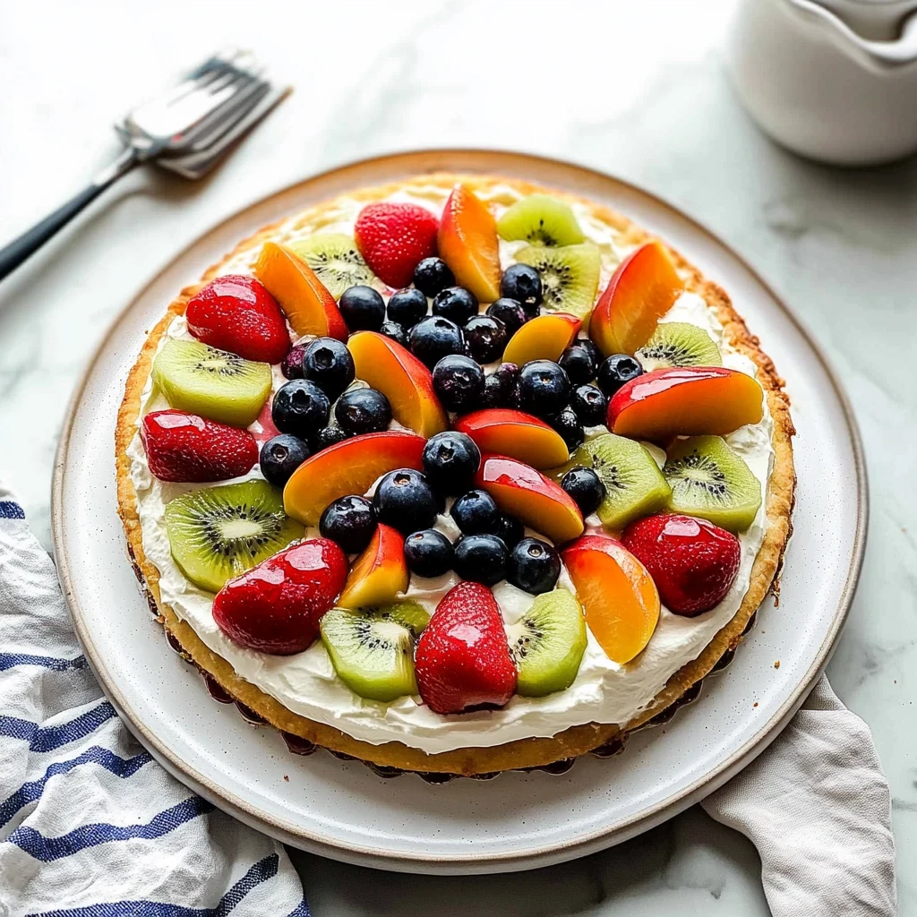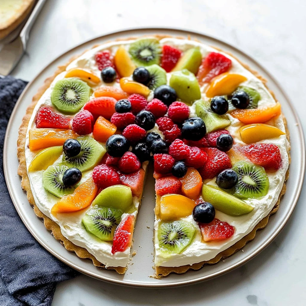 This delightful dessert brings back memories of sunny picnics and cheerful gatherings where laughter fills the air and everyone eagerly reaches for another slice. Perfect for celebrations or simply as a fun family dessert night, this fruit pizza is sure to bring smiles and joy to your table. Get ready to impress your friends and family with this visually stunning and deliciously satisfying dish that promises to be the highlight of any occasion.