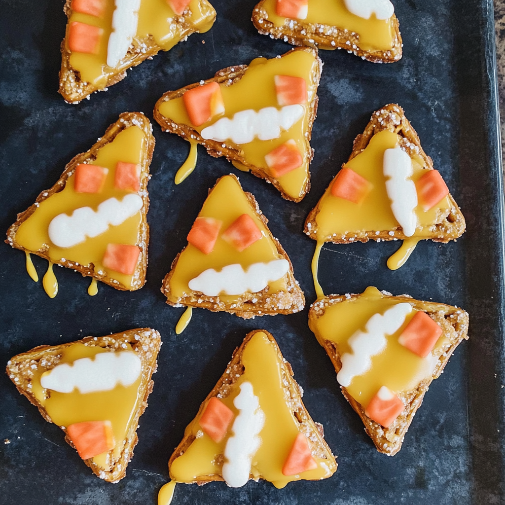 Add Candy Corn: While the chocolate is still wet, sprinkle candy corn generously on top of each coated pretzel. Press gently so they stick nicely.