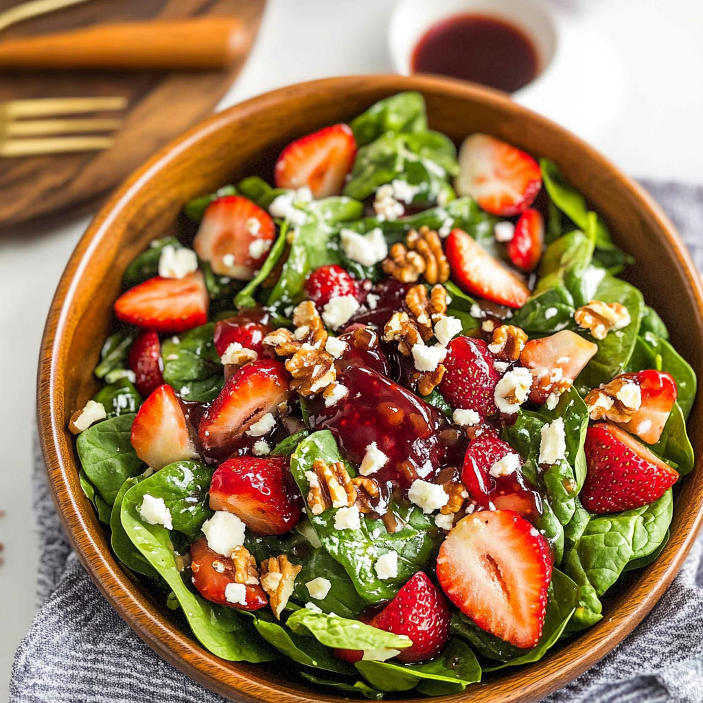 Imagine sinking your fork into crisp spinach leaves, followed by the burst of sweet strawberries dancing on your palate. The light tang of dressing brings everything together like a well-rehearsed dance troupe. Perfect for picnics, backyard barbecues, or just because it’s Tuesday — this salad is a versatile showstopper that will have everyone asking for seconds!