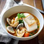 - Add mixed shellfish and halibut chunks; cook until shellfish open and halibut flakes easily (about 8–10 minutes).