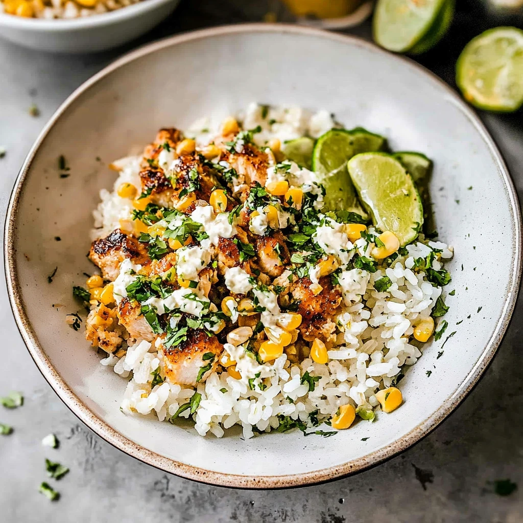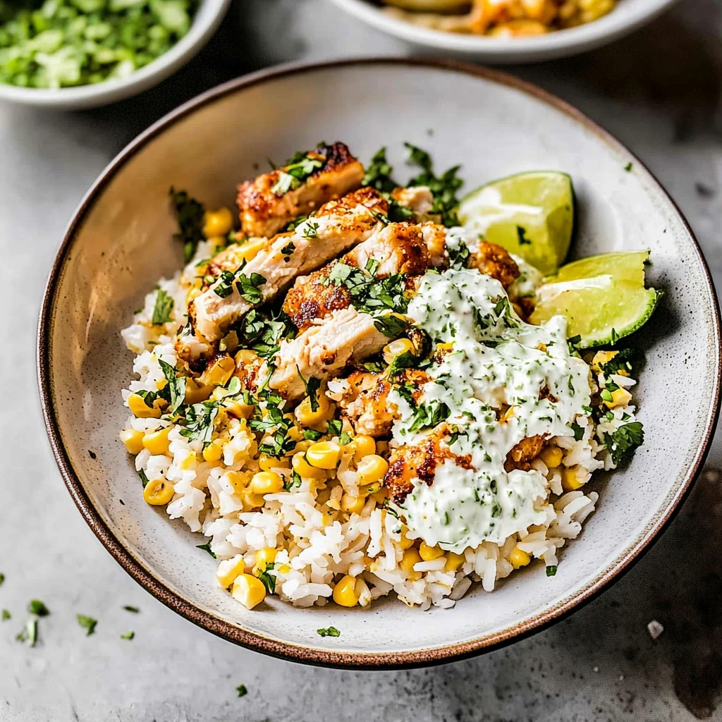 A street corn chicken rice bowl combines grilled chicken, corn, rice, and flavorful toppings for a delicious meal.